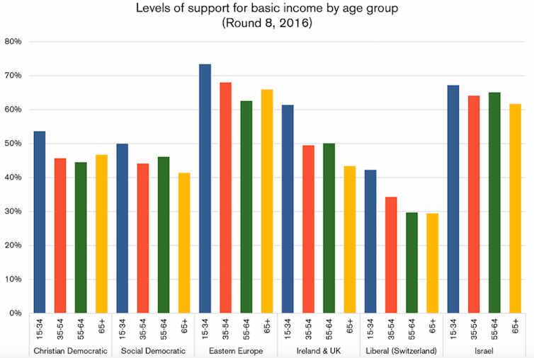 كشف تحليل لاستبيان أجري في دول مختلفة من أوروبا أن الشباب يميلون لتفضيل فكرة الدخل الأساسي العالمي أكثر من أقرانهم الأكبر سناً. ويتفاوت الدعم الذي يحظى به هذا المخطط بين مختلف أرجاء القارة الأوروبية، حيث كان الشباب في روسيا أكثر المتحمسين لهذه الفكرة، في حين كان أقرانهم في الدول الاسكندنافية من أقل المؤيدين لها.
