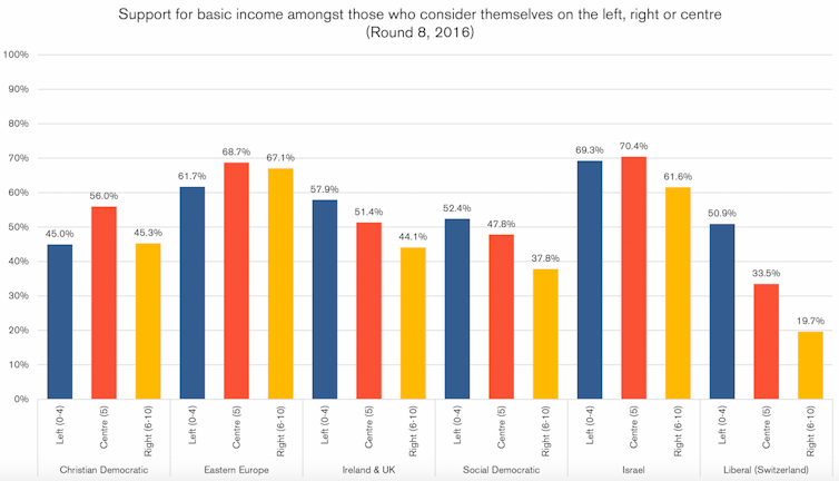كما طلبنا من المشاركين في الاستبيان الاجتماعي الأوروبي أن يقيّموا أنفسهم وفق مقياس لليمين أو اليسار السياسي، حيث يمثل الرقم 0 اليسار المتطرف ويمثل الرقم 10 اليمين المتطرف، وكان الموجودون على الطرف الأيمن من المقياس أقل تأييداً لفكرة الدخل الأساسي العالمي، لكن مستويات الدعم بين هؤلاء كانت أعلى من المتوقع، إذ يبدو بأن الدعم الذي تحظى به فكرة الدخل الأساسي العالمي يتحدى المفاهيم السياسية التقليدية، حيث لا تنتمي إلى اليسار أو اليمين، بل تشكّل مجموعةً جديدة كلياً.